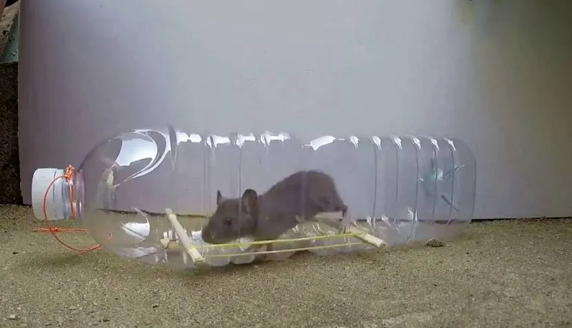 Смысл ловушки заключается в том, что мышь, проникнув в бутылку – побежит к наживке. Оказавшись в задней (свисающей части), накренит ёмкость, она наклонится и полетит вниз. Упасть бутылке не позволит шнурок — так ловушка окажется подвешенной в воздухе, а выбраться наружу грызун не сможет из-за узкого отверстия.