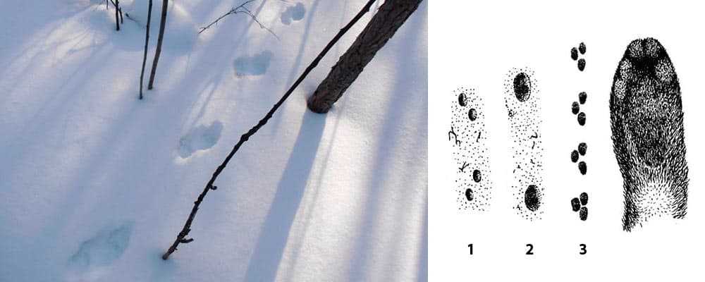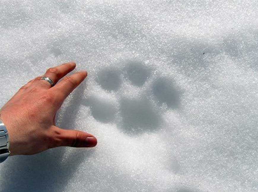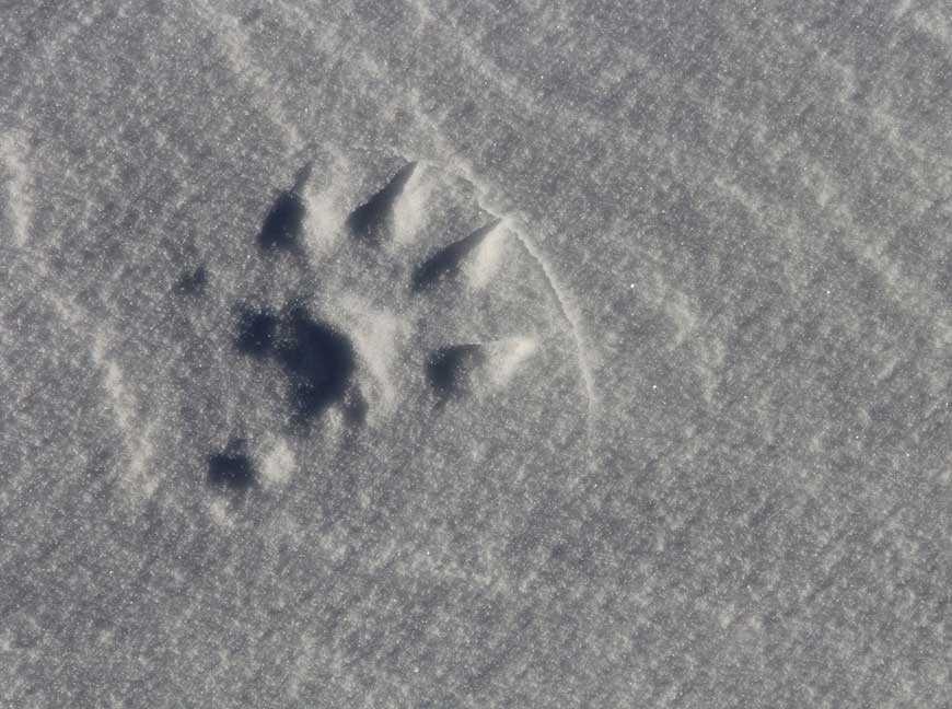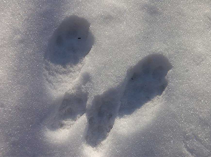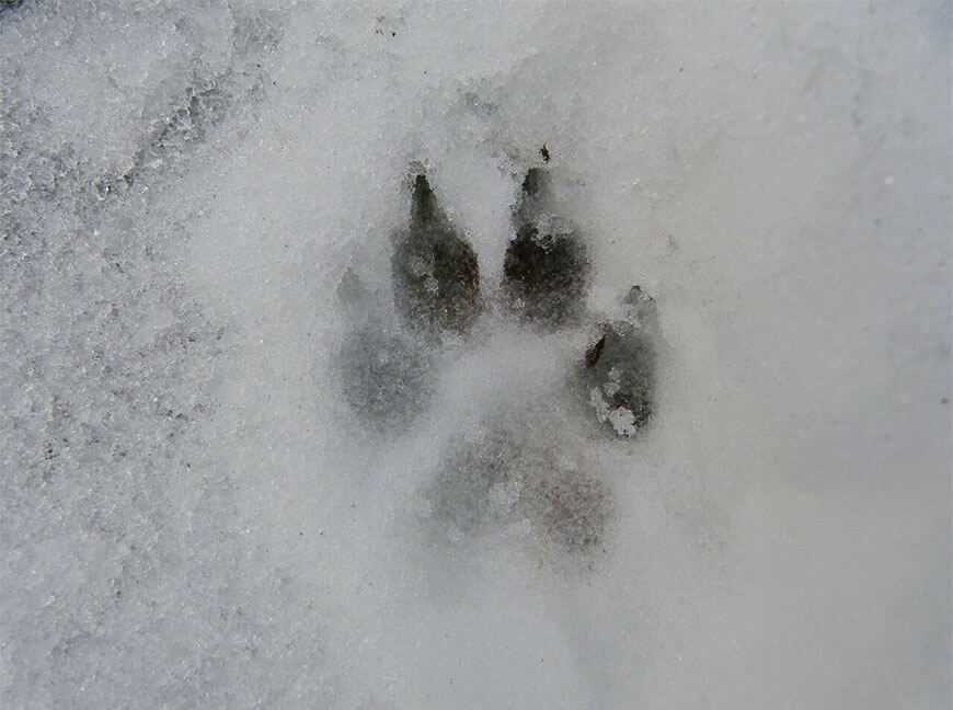 Задняя лапа чуть меньше. На снегу часто отпечатывается пястная мозоль в форме подковы и расположенная прямо за ней запястная мозоль. Первый самый короткий палец передних и задних лап может не отпечатываться на снегу.