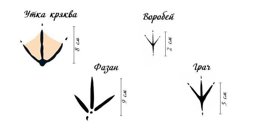 Очень легко распознать следы утки (кряквы): в них четко прорисованы перепонки. Фазаны оставляют довольно крупные следы с характерным отпечатком шпоры.