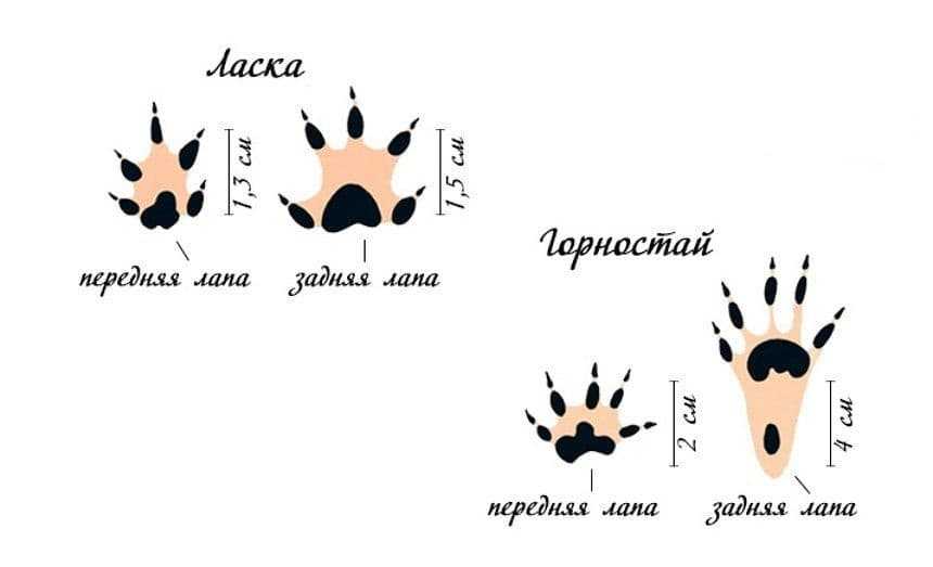Ласки и горностаи тоже охотятся на мелких грызунов и домашнюю птицу по ночам. Эти юркие животные внешне очень похожи, но горностай крупнее ласки, поэтому его следы почти в 2 раза больше.