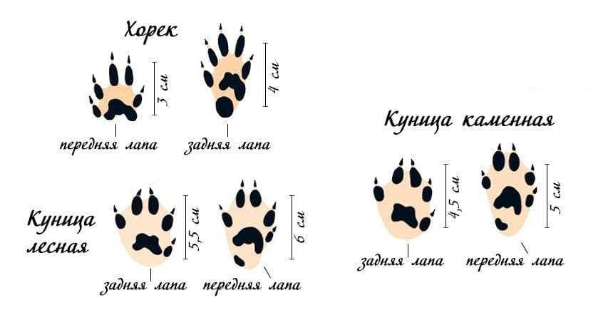 Задние лапки оставляют длинные и узкие отпечатки, а передние – более округлые. Хорошо заметны острые когти. Хорьки передвигаются прыжками, поэтому расстояние между отпечатками составляет 45-55 см. Размер отметины передней лапы – 2,3*3,5 см, задней – 3,5*4,7 см.