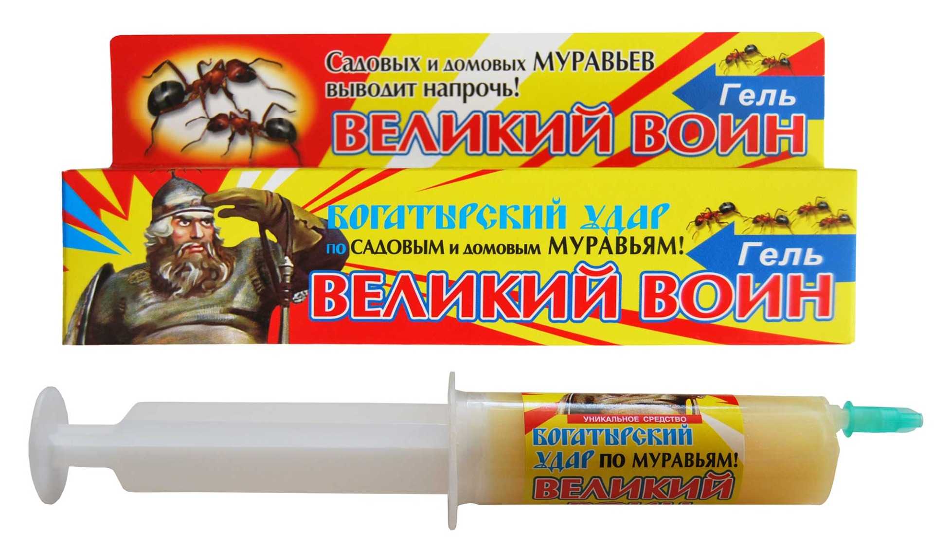 - «Великий воин». Гель, продающийся в шприце. Нескольких капель достаточно для полного уничтожения муравейника. По времени это занимает примерно неделю.
