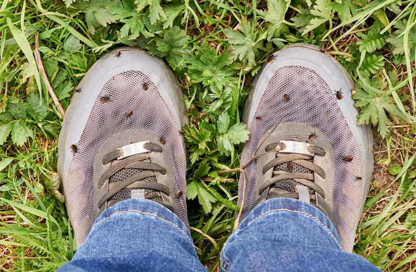 - Избегайте мест, где могут быть клещи (кусты, трава);