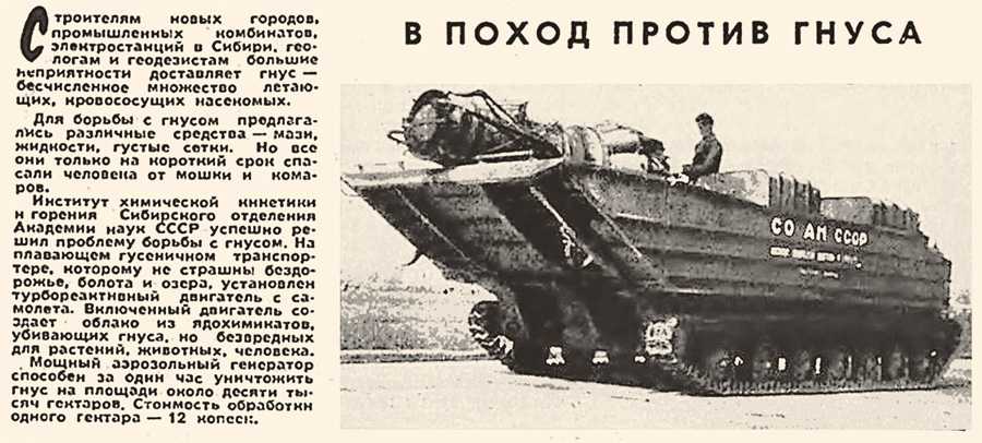 На старой вырезке из газеты — плавающий гусеничный транспортёр с турбореактивным двигателем от самолёта для распыления ядохимикатов, убивающих гнуса. За один час чудо советской науки избавляло от кровососущих насекомых 10 тыс. га тайги. 1970-е гг.