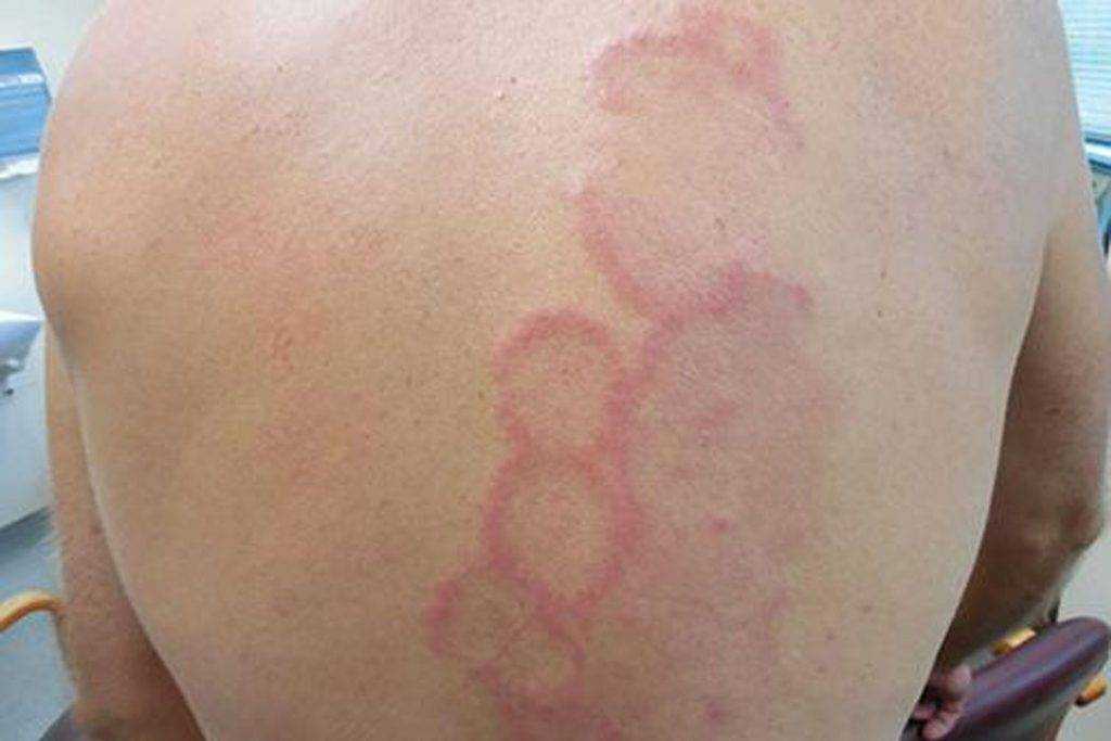 Признаки клещевого боррелиоза на первой стадии характеризуется появлением на коже эритемы, которая имеет форму кольца. Появляется на месте укуса клеща и после расходится на другие участки кожи.