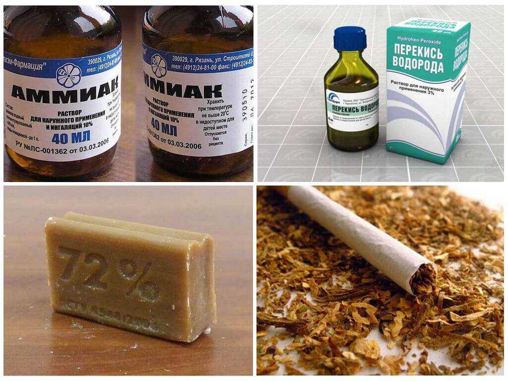 - нашатырный спирт – приготовить раствор из расчета 20 мл аммиака на 10 л воды, разбрызгать на растения (аммиак отпугивает вредителей запахом);