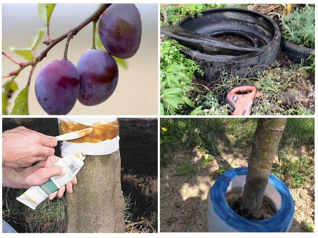 Если же крона сливы не позволяет продеть покрышку сквозь нее, конструкцию разрезают, устанавливают подобным образом и при помощи герметика или пластилина ликвидируют стык.