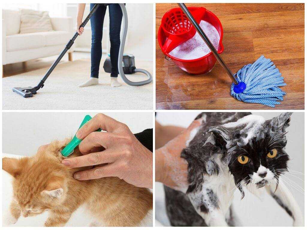 Прежде всего, нужно заняться местом, где обитает животное — подстилку необходимо поменять или прокипятить. Затем, следует обработать все поверхности в квартире, на которых могут остаться взрослые особи паразитов, их яйца и личинки.
