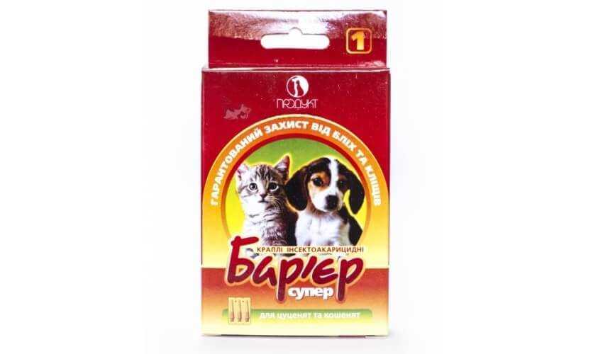 Капли «Барьер-супер» №1 предназначены специально для щенков. Они применяются для уничтожения паразитирующих насекомых и предостережения от их появления. В основе препарата лежит активное вещество Фипронил, которое не проникает в кровь малыша, а всего лишь задерживается в подкожном слое, выполняя положенную ему функцию. Но при этом средство достаточно эффективно и заслуживает первого места в рейтинге противопаразитарных препаратов.