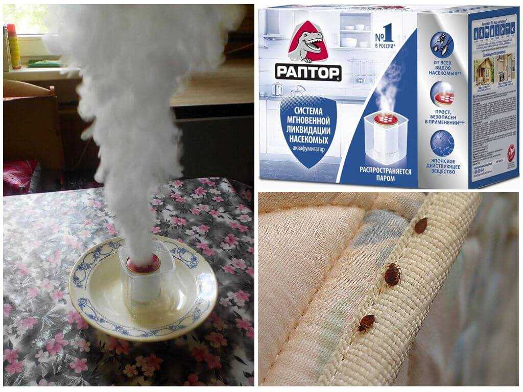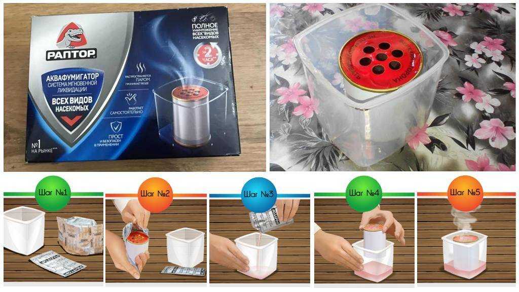 Раптор для тараканов в виде аквафумигатора – уникальная продукция, не имеющая прямых аналогов. Специальную емкость заполняют водой, помещают баночку с активным веществом, вверху которой находятся отверстия. В процессе химической реакции начинает выделяться ядовитый дым с мелкими капельками влаги. Оседает на поверхности, проникает в щели, пропитывает мягкие ткани. Действие продолжается 2 часа.