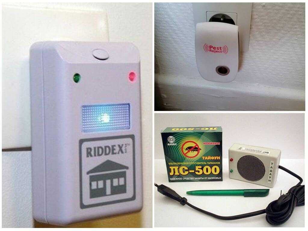 | Ультразвуковые отпугиватели | Удобство в применении, работа в холоде, безопасность, малотоксичность | Не справляются с насекомыми, сильно заразившими помещение | Выпускаются самых разных форм. Некоторые модели оснащены дополнительными функциями (работа в разном режиме, автоматическое переключение частот, работа в холоде и пр.). Достаточно вставить устройство в розетку. Главное, не отключать его, пока тараканы окончательно не покинут помещение |