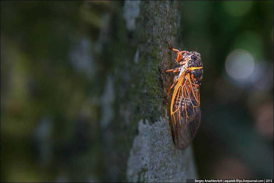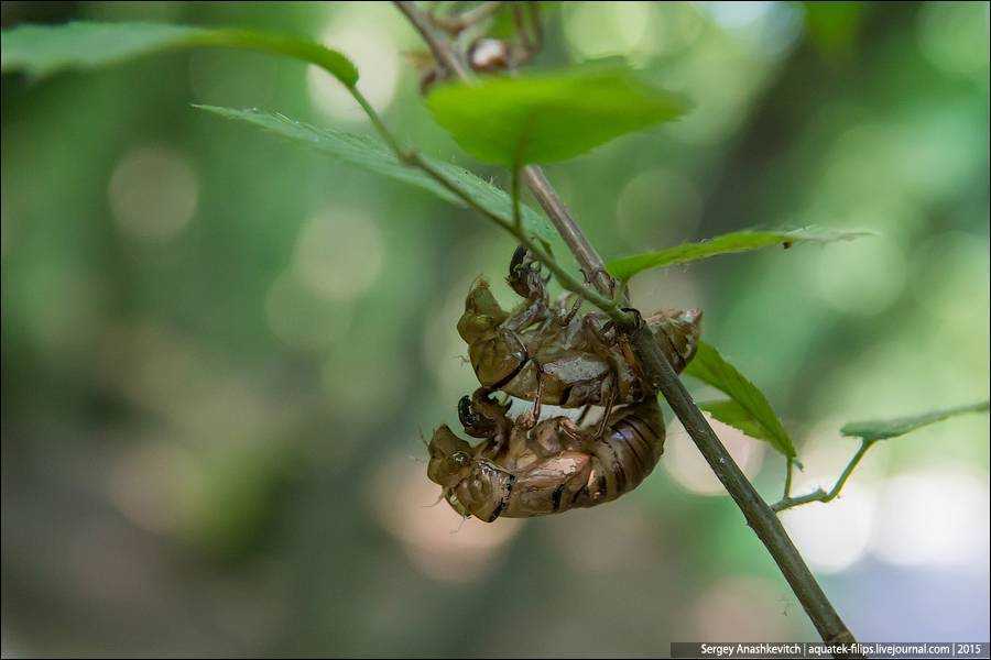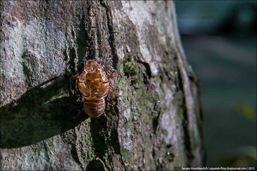 5. У цикад очень необычный жизненный цикл, о котором стоит рассказать подробно.Цикады откладывают яйца под кору тонких веточек или в черешки листьев. Самка при этом надрезает кору пильчатым яйцекладом, в результате чего кончики ветвей или листья засыхают. Личинки по выходе из яиц падают на землю и зарываются в почву, где и протекает их дальнейшее развитие. У разных видов цикад личинки зарываются на разную глубину, иногда более 1 м. В земле они питаются корнями деревьев и трав. Тело личинки беловатое с очень мощными передними копательными ногами. Под землей личинки делают вокруг себя колыбельку с уплотненными стенками и сидят там, в зависимости от вида, от 2 до 17 лет.А затем однажды летом, одновременно пробив путь на белый свет, выползают из своих нор…В этом лесу нам повезло увидеть не обыкновенных певчих, эти под землю сидят “всего” 4 года, а периодических цикад (Cicada septemdecim), которые предыдущий раз появлялись здесь со своим пронзительным скрипом далеких 17 лет назад.