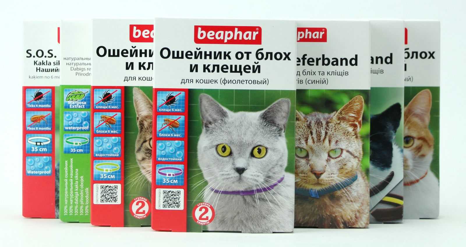 Противопаразитный ошейник, который быстро убивает блох и клещей, а также активно борется с ушными и чесоточными клещами. Активный компонент – тетрахлорвинфос – является инсектицидом контактного действия. Он безопасен для любых домашних животных и токсичен для членистоногих. Уже через пару секунд после контакта с ним блоху или клеща парализует. Ограничение по возрасту – шесть месяцев. То есть котятам моложе полугода «Беафар» носить нельзя.