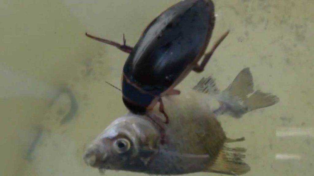 Увидеть можно как жук лежит на поверхности к верху брюшком, таким образом, он наполняет органы воздухом, чтобы можно было какое-то время пробыть затем под водой, и вернуться к охоте.
