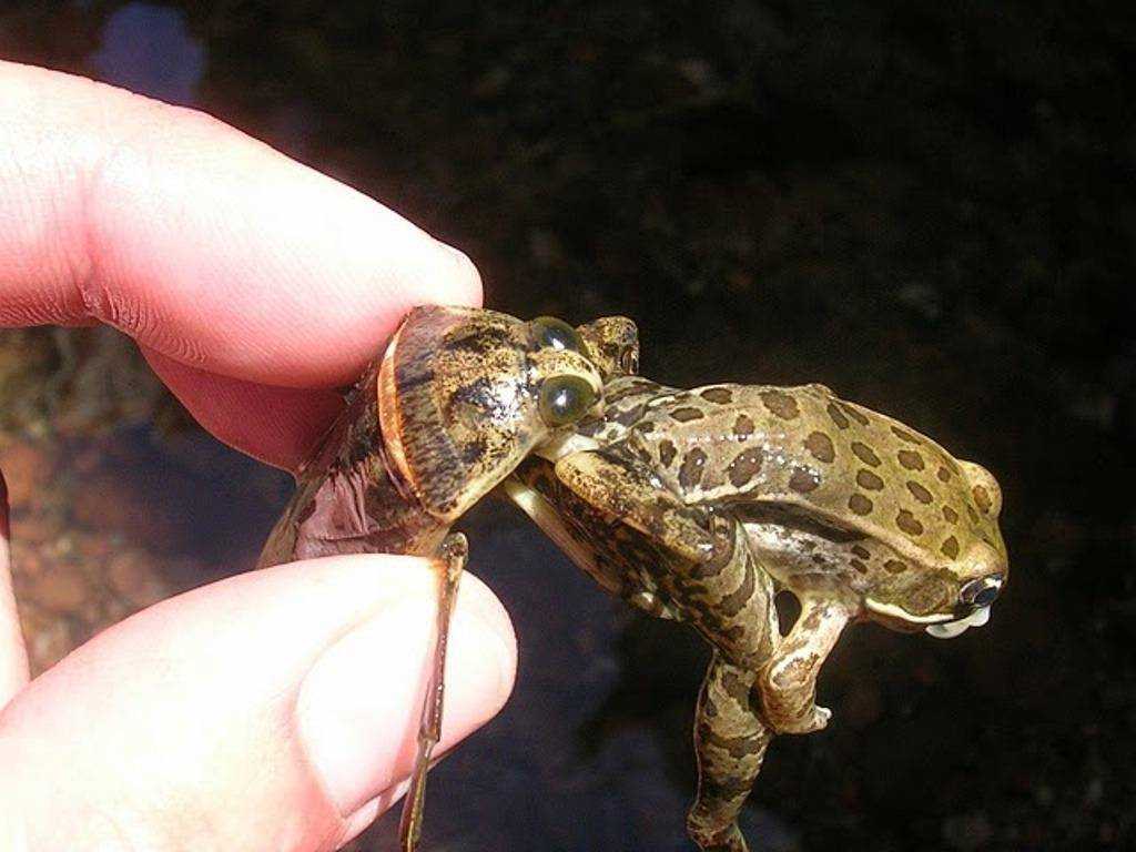 Выбрав подходящую самку, мужская особь устраивается у нее на спине, закрепляясь на скользкой поверхности. Помогает ему в этом две присоски, разместившиеся на передних лапках. Причем самка весь процесс спаривания проводит под водой, а ее партнер, находящийся сверху, способен дышать. Кончик брюшка, торчащий над поверхностью воды, помогает ему в этом.