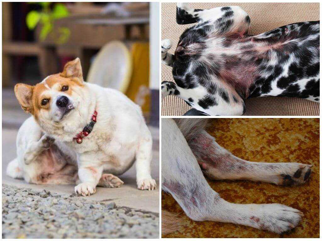 В случаях, когда собака все время чешется, то даже в отсутствии блох кожа на отдельных частях тела приобретает ярко-красный окрас, а шерсть выпадает.