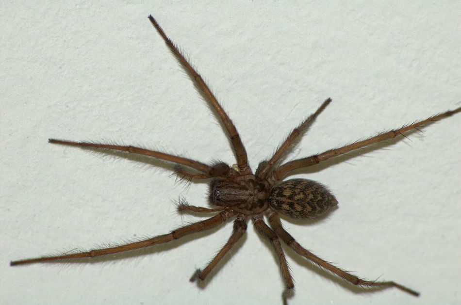 , самый известный и распространенный. Паутину плетет в укромном месте: на потолке, в углу, за шкафом. Самец размером до 10 мм, самка чуть больше — до 12 мм. Окрас желто-серый с бурыми пятнами.