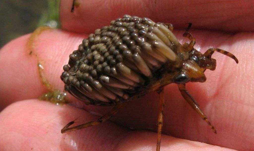 Водяной клоп с яйцами на спине пробудет полмесяца. В это время он становится малоподвижным, почти не выходит на охоту и практически перестаёт питаться. С такой ношей самец будет находиться до появления потомства.