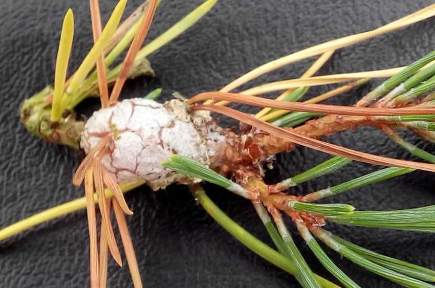 деревьев, похожие на шишку галлы. Есть несколько видов этих вредителей. В конце июня активен ранний, образующий мелкие овальные галлы на концах ветвей. Желтый хермес активизируется в августе, он развивает зеленые крупные галлы. Поздний вид вредителей образует крупные шаровидные галлы в конце августа-сентябре.