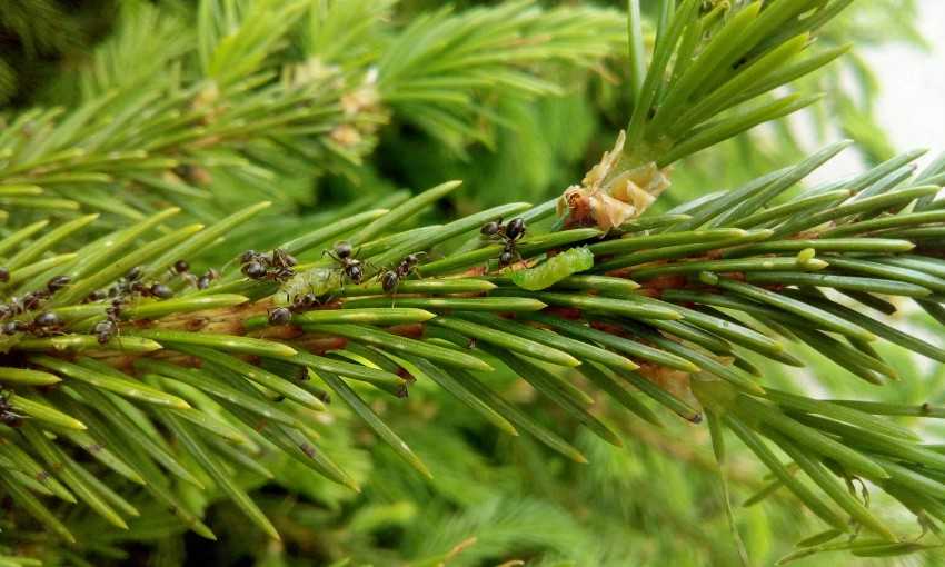 Случается, что с хвойных растений начинают осыпаться иголки. Если приглядеться, то в кроне можно обнаружить зеленых ложногусениц – это пилильщики. Начиная с мая молодые особи объедают хвою с боков, оставляя серединную жилку. Поврежденная, она желтеет и высыхает. Взрослые вредители уничтожают иглы полностью, до пенька. Например, у сосны за период жизни личинка может съесть 30-40 иголок.