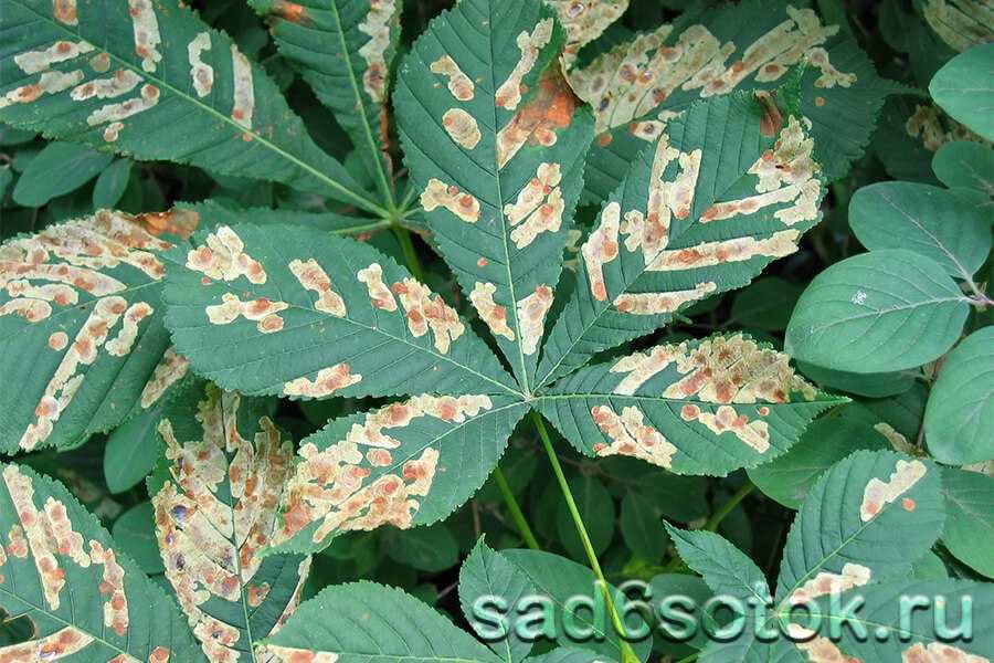 Если между жилками листа появляются бело-зеленые пятна, которые постепенно буреют, значит, растение поражено личинками маленькой моли Cameraria ohridella. Обследовав лист на просвет, вы обнаружите в проточенных вредителями минах (ходах) самих молей-минеров и их выделения.